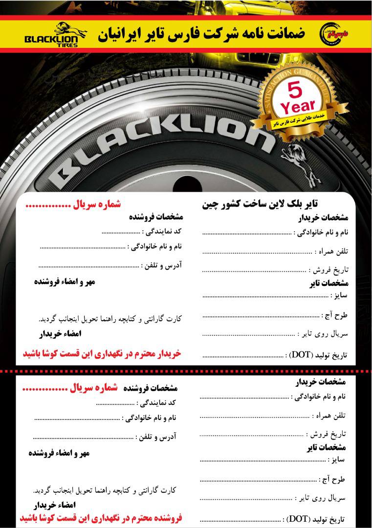 - تایرهای عرضه شده توسط این شرکت اعم از تولیدی یا وارداتی از تاریخ تولید به مدت ۵ سال توسط شرکت ضمانت می گردند.